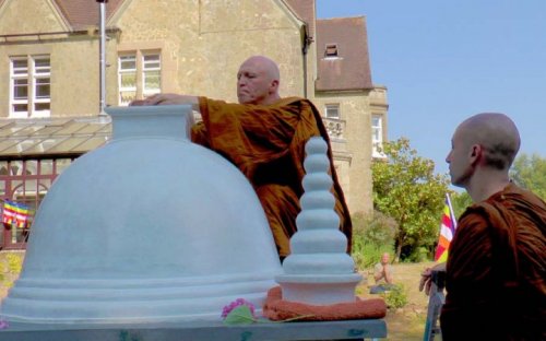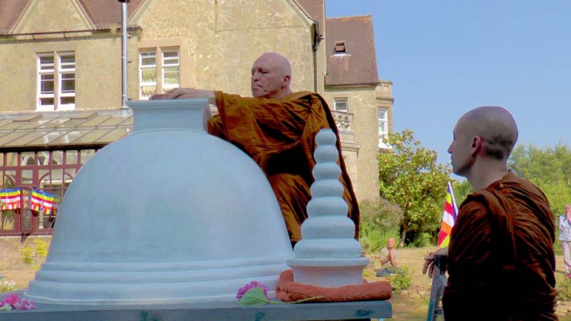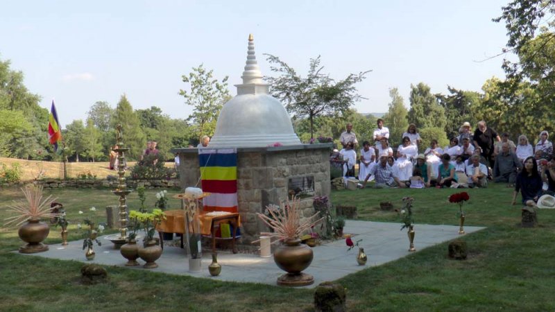 At the invitation of the Chittaviveka Monastery, Don Sirimal Rajapaksha, a well-known artist in London, build the Ananda Maithriya Stupa in the style of the Maha Thupa in Anuradhapura Sri Lanka.